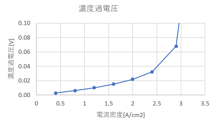 燃料電池の出力電圧は、理論電圧(約1.23 V)よりも低くなります。その要因のひとつが濃度過電圧(ηconcです。