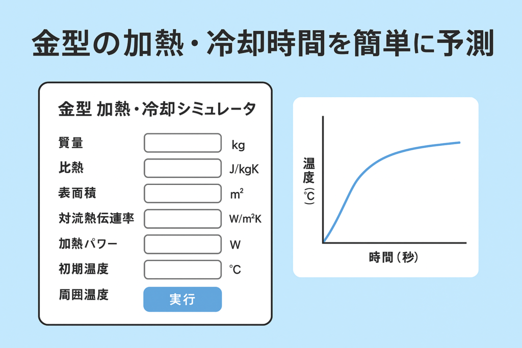 金型の加熱時間・冷却時間をサッと見積もりたい──そんなときに便利な ブラウザで動く軽量シミュレーションツール を作成しました。 金型の質量・比熱・表面積・加熱パワーなどを入力すると、温度が何分で上がるか/下がるか をグラフで直感的に確認できま... 熱伝導